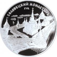 Реверс: изображение панорамы памятников архитектуры Соловецкого монастыря. Вверху по кругу надпись: «Соловецкий монастырь» и дата «XV в».