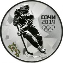 Реверс: в центральной части диска слева - рельефное изображение хоккеиста, ведущего шайбу, справа от него в три строки - надпись: "СОЧИ", дата: "2014" и пять олимпийских колец, слева внизу, у канта - цветное изображение ветви пробкового дуба.