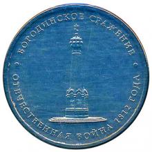 Реверс: в центре диска - рельефное изображение памятника героям Отечественной войны 1812 года, вдоль канта по окружности - надписи, разделенные двумя точками, вверху: "БОРОДИНСКОЕ СРАЖЕНИЕ", внизу: "ОТЕЧЕСТВЕННАЯ ВОЙНА 1812 ГОДА".
