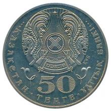 Аверс: в верхней части изображен герб Республики Казахстан и под ним надпись "50 ТЕҢГЕ", расположенная в две строки. Слева и справа от номинала изображен элемент национального орнамента. По окружности надпись "ҚАЗАҚСТАН ҰЛТТЫҚ БАНКІ".
