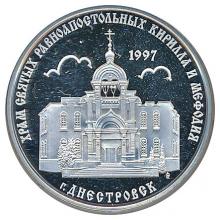 Реверс монеты: в центре – изображение Кирилло-Мефодиевской церкви, над ним – надпись «1997»; по кругу – надписи: вверху – «ХРАМ СВЯТЫХ РАВНОАПОСТОЛЬНЫХ КИРИЛЛА И МЕФОДИЯ», внизу – «г. ДНЕСТРОВСК».