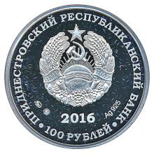 Аверс монеты: в центре – изображение Государственного герба Приднестровской Молдавской Республики; по кругу – надписи: вверху – «ПРИДНЕСТРОВСКИЙ РЕСПУБЛИКАНСКИЙ БАНК», внизу – «100 РУБЛЕЙ»; в нижней части под гербом – год выпуска монеты «2016», слева – логотип изготовителя, государственное пробирное клеймо, справа – обозначение металла, проба сплава.