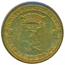 Аверс: герб города Архангельска, над ним, на ленте – надпись полукругом: "ГОРОДА ВОИНСКОЙ СЛАВЫ", внизу, вдоль канта – надпись: "АРХАНГЕЛЬСК".