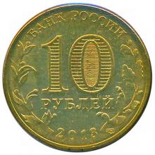 Реверс: в центре диска – обозначение номинала монеты "10 РУБЛЕЙ". Внутри цифры "0" – скрытые, видимые поочередно при изменении угла зрения изображения цифры "10" и надписи "РУБ". По окружности вдоль канта – надписи, вверху: "БАНК РОССИИ", внизу – дата: "2013", слева – стилизованное изображение оливковой ветви, справа – дубовой.
