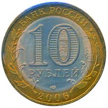 Аверс: в центре диска – обозначение достоинства монеты «10 РУБЛЕЙ». Внутри цифры «0» – скрытые, видимые поочередно при изменении угла зрения изображения цифры «10» и надписи «РУБ». В нижней части диска – товарный знак монетного двора. В верхней части кольца по окружности – надпись: «БАНК РОССИИ», в нижней – дата «2006», слева и справа – стилизованные ветви растений, переходящие на диск.