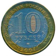 Аверс: в центре диска – обозначение достоинства монеты «10 РУБЛЕЙ». Внутри цифры «0» – скрытые, видимые поочередно при изменении угла зрения изображения цифры «10» и надписи «РУБ». В нижней части диска – товарный знак монетного двора. В верхней части кольца по окружности – надпись: «БАНК РОССИИ», в нижней – дата «2007», слева и справа – стилизованные ветви растений, переходящие на диск.