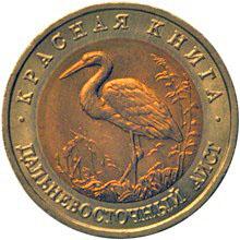 Реверс: изображение дальневосточного аиста на фоне травянистой растительности, по окружности надписи, разделённые двумя точками: вверху - "КРАСНАЯ КНИГА", внизу - "ДАЛЬНЕВОСТОЧНЫЙ АИСТ".