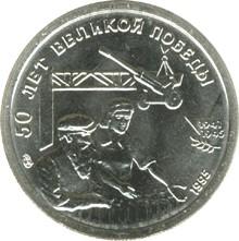 Аверс: изображения мужчины и женщины в заводском цехе, на втором плане - пушка справа - даты в две строки: "1941", "1945", лавровая ветвь и год чеканки "1995 г.", слева - товарный знак монетного двора, вверху по окружности - надпись: "50 ЛЕТ ВЕЛИКОЙ ПОБЕДЫ".