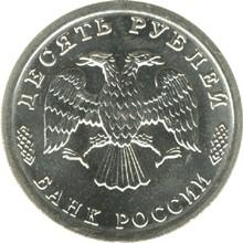 Реверс: в центре диска - эмблема Банка России (двуглавый орёл художника И. Билибина), по окружности надписи: вверху - "ДЕСЯТЬ РУБЛЕЙ", внизу - "БАНК РОССИИ".