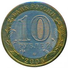 Аверс: в центре диска – обозначение достоинства монеты «10 РУБЛЕЙ». Внутри цифры «0» – скрытые, видимые поочередно при изменении угла зрения изображения цифры «10» и надписи «РУБ». Внижней части диска – товарный знак монетного двора. В верхней части кольца по окружности – надпись: «БАНК РОССИИ», в нижней – дата «2005», слева и справа – стилизованные ветви растений, переходящие на диск.