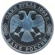 По окружности надписи, обрамлённые кругом из точек: вверху - "ОДИН РУБЛЬ 1993 г.", внизу - "БАНК РОССИИ".