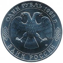 По окружности надписи, обрамлённые кругом из точек: вверху - "ОДИН РУБЛЬ 1993 г.", внизу - "БАНК РОССИИ".