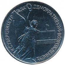 Реверс: скульптурное изображение богини Победы с венком в руке на фоне Дома Советов Российской Федерации в Москве, по окружности - надписи: "СУВЕРЕНИТЕТ", "ДЕМОКРАТИЯ", "ВОЗРОЖДЕНИЕ", разделённые лавровыми ветвями.