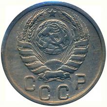 Аверс: в центре восьмиугольный щиток, в нем номинал "15 коп", написанный в две строки.По сторонам щитка слева - дубовые листья и желудь, смотрящие вниз, справа - дубовые листья и желудь, смотрящие вверх. Над щитком колос с остями, образующими гребенку у правой верхней части щитка. Под щитком дата.
