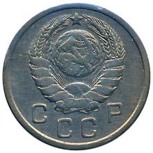 Реверс: герб СССР с семью витками перевязывающей ленты. Под ним полукругом со ступенчатым расположением букв надпись "СССР".