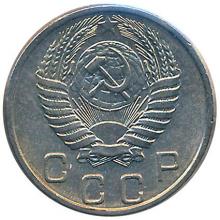 Реверс: герб СССР с семью витками перевязывающей ленты. Под ним полукругом со ступенчатым расположением букв надпись "СССР".