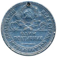 Реверс: верхний сектор монеты занимает герб СССР ссемью витками перевязывающей ленты. По сторонам герба снизу надпись "СССР" по две буквы с каждой стороны. В нижнем секторе номинал, написанный в две строки: "ОДИН полтинник". Между двумя круговыми ободками - точечным и линейным - лозунг "Пролетарии всех стран, соединяйтесь!".