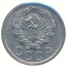 Реверс: герб СССР с семью витками перевязывающей ленты. Под ним полукругом со ступенчатым расположением букв надпись "СССР".