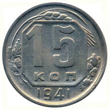 Аверс: в центре восьмиугольный щиток, в нем номинал "15 коп", написанный в две строки.По сторонам щитка слева - дубовые листья и желудь, смотрящие вниз, справа - дубовые листья и желудь, смотрящие вверх. Над щитком колос с остями, образующими гребенку у правой верхней части щитка. Под щитком дата.