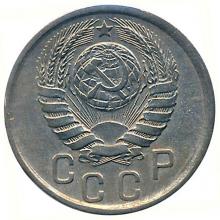 Реверс: герб СССР с семью витками перевязывающей ленты. Под ним полукругом со ступенчатым расположением букв надпись "СССР".