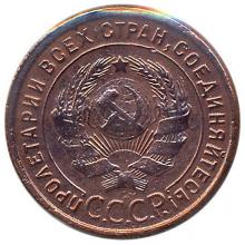 Реверс: герб СССР с семью витками перевязывающей ленты, под ним надпись "СССР", от которой начинается линейный круговой ободок. Между обрезом монеты и ободком лозунг "Пролетарии всех стран, соединяйтесь!".