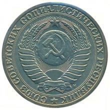 Реверс: в середине герб СССР с пятнадцатью витками перевязывающей ленты, обрамленный круговым ободком из сдвоенной линии. Между ним и обрезом монеты надпись "Союз Советских Социалистических Республик". Начало и окончание надписи разделено звездочкой.