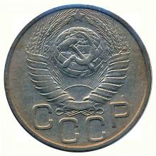 Аверс: в центре восьмиугольный щиток, в нем номинал "20 коп", написанный в две строки.По сторонам щитка слева - дубовые листья и желудь, смотрящие вниз, справа - дубовые листья и желудь, смотрящие вверх. Над щитком колос с остями, образующими гребенку у правой верхней части щитка. Под щитком дата.